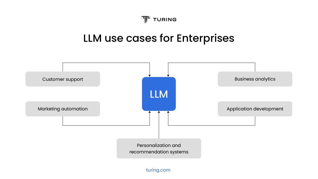 LLMs are widely used for customer support automation, content generation, data analysis, knowledge management, and multilingual support.